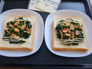 朝食朝食 鮭ほうれん草カレー粉マヨサンド 2025年10月3日 | by ミドリ朝食 鮭ほうれん草カレー粉マヨサンド。食パンに、ごま油でほぐした鮭・ほうれん草を炒めてカレー粉で味付けしたものをのせて、白ごま・マヨネーズをかけた。ごま油を使ったので香りがよく、カレー粉ともあって美味しかった