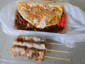 昼食, 外食/テイクアウト昼食 オムソバと豚串 2025年10月5日 | by ミドリ昼食 オムソバと豚串。近くの公園でイベントがあったので、屋台のお店でオムソバ・豚串を買ってきた。豚串はお肉が少し硬かったが、オムソバは太麺でモチモチして美味しかった