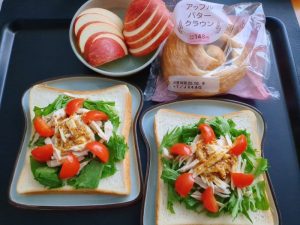 朝食朝食 サラダチキン水菜トマトはちみつマスタードサンド 2025年10月9日2025年10月9日 | by ミドリ朝食 サラダチキン水菜トマトはちみつマスタードサンド。食パンに、水菜・サラダチキン・ミニトマトをのせて、オリーブオイル・粒マスタード・はちみつ・レモン汁で作ったドレッシングをかけた。クラシルのマスタード和えを参考にして、和えずにドレッシングにしてかけた 今朝コンビニで買った、アップルバタークラウンも食べた