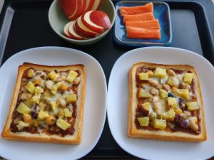 食パンに、カレーを塗り、さつまいも・ミックスビーンズ・ミックスチーズをのせて、粉チーズをかけてトースターで焼いた。