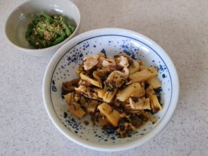 昼食, 残りもの昼食 長いも豚肉高菜炒め 2025年10月10日2025年10月10日 | by ミドリ昼食 長いも豚肉高菜炒め。冷凍在庫の、長いも豚肉高菜炒め。レンジで加熱をした、いんげんの胡麻和え。ご飯のお供は、しそ昆布、キャベツのかんたん酢。ゆず海苔缶を空けたら1枚もなく、食べ終わっていたのに気づいていなかった