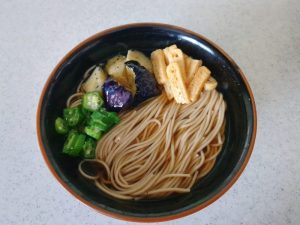 昼食 揚げ茄子と油揚げおくら蕎麦。