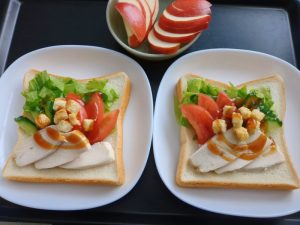 食パンに、レタス・トマト・きゅうり・サラダチキン・クルトンをのせて、青じそドレッシングをかけた。