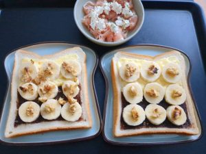 食パンに、カスタードクリーム・チョコレートソースを塗り、バナナとくるみをのせた。