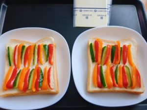 食パンに、マヨネーズを塗り、カンタン酢に漬けて作った、きゅうりとパプリカのピクルスをのせた。
