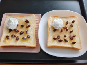 食パンに、ゆず茶・ホイップクリームを塗り、レーズンをのせて、ミルクティー・練乳をかけた。