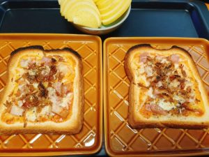食パンに、マーガリン・ピザソースを塗り、ベーコン・フライドオニオン・ミックスチーズをのせてトースターで焼き、ガーリックパウダー・黒コショウをかけた。