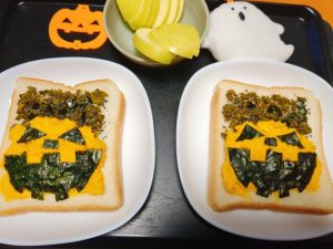 朝食朝食 ハロウィンかぼちゃサンド 2025年10月31日 | by ミドリ朝食 ハロウィンかぼちゃサンド。食パンに、マッシュしたかぼちゃにクリームチーズとマヨネーズを混ぜたもの、かぼちゃの皮に黒ごまとマヨネーズを混ぜて塗り、海苔を切って顔にした。ハロウインかぼちゃ風にしてみた