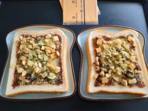 朝食 アーモンドくるみフルーツきなこ抹茶サンド。
