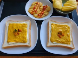 食パンに、モッツァレラチーズをのせて、かぼちゃとさつまいもで作ったポタージュを塗った。