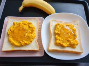 朝食 かぼちゃクリームチーズ練乳ゆず茶サンド。