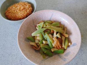 ありあわせ, 昼食昼食 ちくわブロッコリーの茎ヤミー炒め 2025年11月12日 | by ミドリ昼食 ちくわブロッコリーの茎ヤミー炒め。ちくわ・ブロッコリーの茎を炒めて、ヤミ―ガーリックペッパーとマヨネーズで味付けをした。コロッケは2人で1個を分けた ご飯のお供は、味付け海苔、ねり梅。