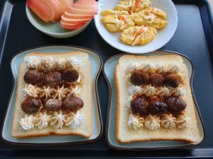 食パンに、クリームチーズ・ホイップクリームを塗り、甘栗をのせて、インスタントコーヒー・てんさい糖をかけた。