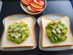 食パンに、そら豆をオリーブオイルで炒めて、黒コショウ・ガーリックパウダー・レモン汁で味付けしたものをのせて、粉チーズを振った。