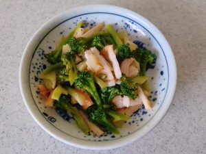 ちくわ、ブロッコリーとブロッコリーの茎を炒めて、塩焼きそばの粉末で味付けをした。