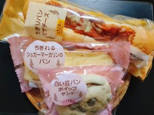 ちぎりパンピザチーズ、ちぎれるシュガーマーガリンのパン、白い豆パンホイップサンド。