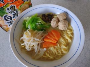 生麺2玉を茹で、鍋キューブの濃厚白湯(2個)と創味シャンタン 大さじ1、水700miでスープを作った。