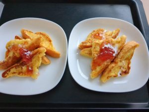 朝食朝食 ヨーグルトのフレンチトースト 2025年12月7日 | by ミドリ朝食 ヨーグルトのフレンチトースト。食パンを4等分に切り、ヨーグルト・卵・てんさい糖と牛乳を少し加えた液に一晩浸しておいた。バターで両面を焼いて、いちごジャムとコーヒーフレッシュをかけて食べた。クラシルのレシピを参考にしたが、とても美味しかった