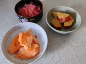 ありあわせ, 昼食昼食 塩銀鮭 2025-12-10 2025年12月10日 | by ミドリ昼食 塩銀鮭。まとめて焼いておいた塩銀鮭は、これで最後 さつまいもの甘煮、栄養煮。紅大根の甘酢漬け、にしん漬けは、どちらもお隣さんからの頂き物