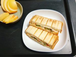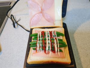 食パンに、スライスチーズ・ロースハム・いんげんをのせて、ケチャップ・マヨネーズをかけて挟んで焼いたホットサンド。