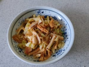 ありあわせ, 昼食昼食 キャベツちくわザーサイ炒め 2025年12月11日 | by ミドリ昼食 キャベツちくわザーサイ炒め。ざく切りのキャベツ・ちくわ2本・ザーサイを炒めて、鶏がらスープの素・醤油・コショウで味付けをした。ご飯のお供は、栄養煮、紅大根の甘酢漬け、にしん漬け。お隣からの頂き物があり、助かった~