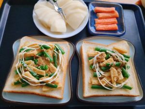 朝食朝食 いんげん油揚げマヨごまサンド 2025年12月16日 | by ミドリ朝食 いんげん油揚げマヨごまサンド。食パンに、マヨネーズ・ねりごまを塗り、いんげん・味付き油揚げをのせて、白ごま・マヨネーズをかけた。油揚げは味が付いているので、このまま食べてOKのもの
