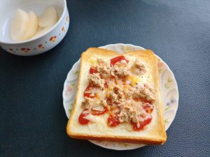 朝食朝食 ケチャップツナチーズトースト 2025年12月18日 | by ミドリ朝食 ケチャップツナチーズトースト。食パンに、ケチャップを塗り、ミックスチーズとツナをのせて、黒コショウをかけてトースターで焼いた。夫は検査入院中で、1人で朝ごはん