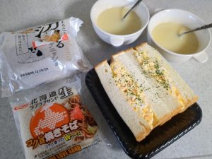 既製品, 昼食昼食 たまごサンドと菓子パン 2025年12月19日 | by ミドリ昼食 たまごサンドと菓子パン。2泊3日の入院生活を終えて、夫が帰宅。そのままスーパーで週末の買い物とお昼に食べるパンを買ってきた たまごサンドと菓子パン、惣菜パン、コーンポタージュ。