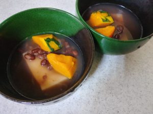 お昼に、かぼちゃ・切り餅を入れたお汁粉を作った。