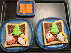 朝食朝食 クリスマスマシュマロサンド 2025年12月24日 | by ミドリ朝食 クリスマスマシュマロサンド。食パンに、チョコレートソースを塗り、クリスマスのマシュマロをのせて、チョコスプレーをかけた。マシュマロは硬めで、不味くはないが美味しいものでもなかった