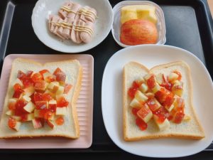 朝食朝食 りんごはちみついちごジャムミントサンド 2025年12月27日 | by ミドリ朝食 りんごはちみついちごジャムミントサンド。食パンに、角切りのりんごをのせて、はちみつ・いちごジャム・ミントパウダーをかけた。クックパッドを参考にして作ったが、酸味と甘さと爽やかさがあり、とても美味しかった