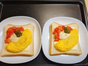 朝食朝食 ミニオムレツジェノベーゼベシャメルサンド 2025年12月29日2025年12月29日 | by ミドリ朝食 ミニオムレツジェノベーゼベシャメルサンド。食パンに、スライスチーズ・ミニオムレツ・ミニトマトをのせて、ベシャメル・ジェノベーゼをかけた。冷凍しておいたミニオムレツ・ベシャメル・ジェノベーゼを使った