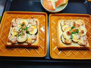 朝食朝食 ウインナー茄子カレーマヨチーズトースト 2025年12月30日 | by ミドリ朝食 ウインナー茄子カレーマヨチーズトースト。食パンに、マヨネーズとカレー粉を塗り、薄切りにした茄子・ウインナーとミックスチーズをのせてトースターで焼き、パセリをかけた。クラシルの茄子を使ったトーストレシピを参考にして作ったが、久しぶりのトーストはサクサクで美味しかった