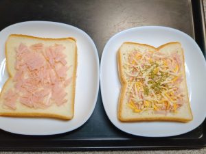 夫(右)は、食パンに、マヨネーズを塗り、細切りのロースハム・ミックスチーズをのせて、黒コショウ・セロリの葉をかけた。