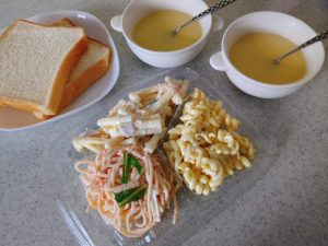 既製品, 昼食昼食 サラダとパン 2026年1月5日 | by ミドリ昼食 サラダとパン。お昼前に買い物に行き、すぐに食べられるサラダの盛り合わせを買ってきた。食パンと一緒に食べ、コーンスープを飲んだ。