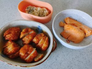 ありあわせ, 昼食昼食 唐揚げと銀鮭 2026年1月6日2026年1月6日 | by ミドリ昼食 唐揚げと銀鮭。冷凍の唐揚げを温め、いつも食べやすいにように切っている。塩銀鮭(残り物)。ご飯のお供は、にしんの切込み。野菜が足りない