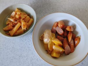 ありあわせ, 昼食昼食 ウインナーとポテト 2026年1月8日 | by ミドリ昼食 ウインナーとポテト。炒めたウインナーと、冷凍のポテト(インカのめざめ)にはクレイジーソルトをかけた。竹の子の土佐煮は既製品で味は美味しいが、一つ一つが大きすぎるので小さく切った。ご飯のお供は、にしんの切り込み。今日も茶色だ