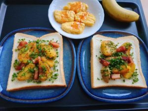 食パンに、フライドポテト・パセリの茎・ベーコンをオリーブオイルで炒めて、ガーリック・クレイジーソルト・黒コショウで味付けしたものをのせた。