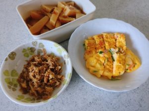 ありあわせ, 昼食昼食 カニカマ青ねぎ卵焼き 2026年1月16日2026年1月16日 | by ミドリ昼食 カニカマ青ねぎ卵焼き。カニカマ2本と長ねぎの青い所を入れて焼いた卵焼き。ご飯のお供は、鶏ガラそぼろ、竹の子の土佐煮。鶏ガラそぼろは冷凍在庫で、ごくたまに骨が残っているので要注意