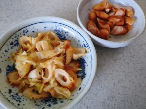 ありあわせ, 昼食昼食 ちくわキャベツ生姜炒め 2026年1月19日2026年1月20日 | by ミドリ昼食 ちくわキャベツ生姜炒め。キャベツ・ちくわ・生姜の千切りを炒め、酒・みりん・醤油で味付けをした。ウインナーはボイルしてソースをかけた。ご飯のお供は、竹の子の土佐煮(ラスト)。ウインナーはソースをかけても美味しい