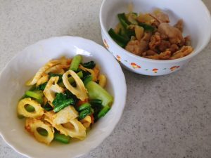 ありあわせ, 昼食昼食 ちくわ小松菜カレー炒め 2026年2月6日 | by ミドリ昼食 ちくわ小松菜カレー炒め。ちくわ・小松菜を炒め、塩コショウ・カレー粉・ターメリック・味の素・醤油で味付けをした。豚肉もみだれ焼き肉(残り物)。ご飯のお供は、たたきごぼう(ラスト)、たくあん。カレー炒めは、カレー粉のほかに色々使ったら、美味しくできた