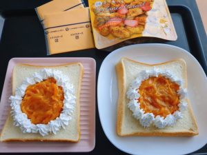 朝食朝食 干し柿シナモンラム酒ホイップクリームサンド 2026年2月8日 | by ミドリ朝食 干し柿シナモンラム酒ホイップクリームサンド。食パンに、干し柿とシナモン・はちみつ・ラム酒・レモン汁を混ぜたものをのせて、ホイップクリームをかけた。私は左の大盛りを食べ、夫は右の甘さ控えめのものを食べた