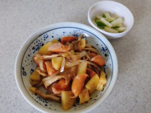 ありあわせ, 昼食昼食 ウインナーじゃがいもマスタード炒め 2026年2月13日 | by ミドリ昼食 ウインナーじゃがいもマスタード炒め。ウインナー・じゃがいも・玉ねぎ・まいたけを炒め、粒マスタード・醤油で味付けしたもの。ご飯のお供は、にしんの切込み(ラスト)、白菜の即席漬け。夫が通院でお昼すぎに出かけるため、お昼は11時半から食べた