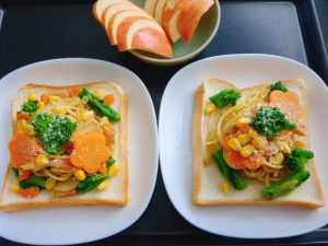 食パンに、菜の花・玉ねぎ・人参・ベーコン入りのカレースパゲティをのせて、粉チーズをかけた。