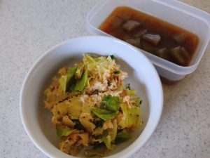 昼食 鶏ひき肉キャベツのレンジ蒸し。