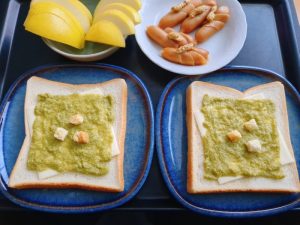 食パンに、モッツァレラチーズをのせて、わさび菜のポタージュを塗り、クルトンをのせた。